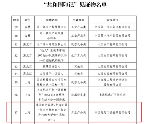 国家工业遗产运十飞机目前位于上飞公司浦东基地,核心物项主要有运十飞机本体、运十飞机的综合文件、工艺规范、工装图、模线样板、产品本体图、飞行纪录、电子文件、工艺文件、试飞文件、质量文件、照片专辑等档案资料。运十飞机的研制是我国民用航空工业的伟大实践和有益探索。在研制过程中,全体参研人员体现出的强烈爱国主义热情和以“航空报国、无私奉献,不畏艰险、永不放弃,艰苦奋斗、团结协作,科技创新、精益求精”为内涵的运十精神,激励着大飞机人在创建国际一流航空企业的伟大征程中奋勇拼搏、建功立业。